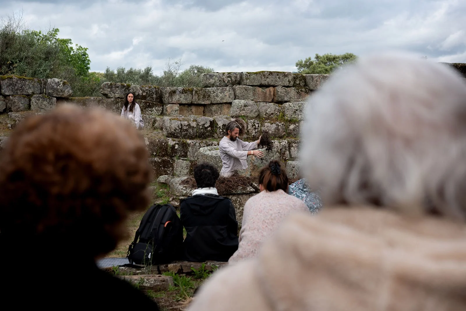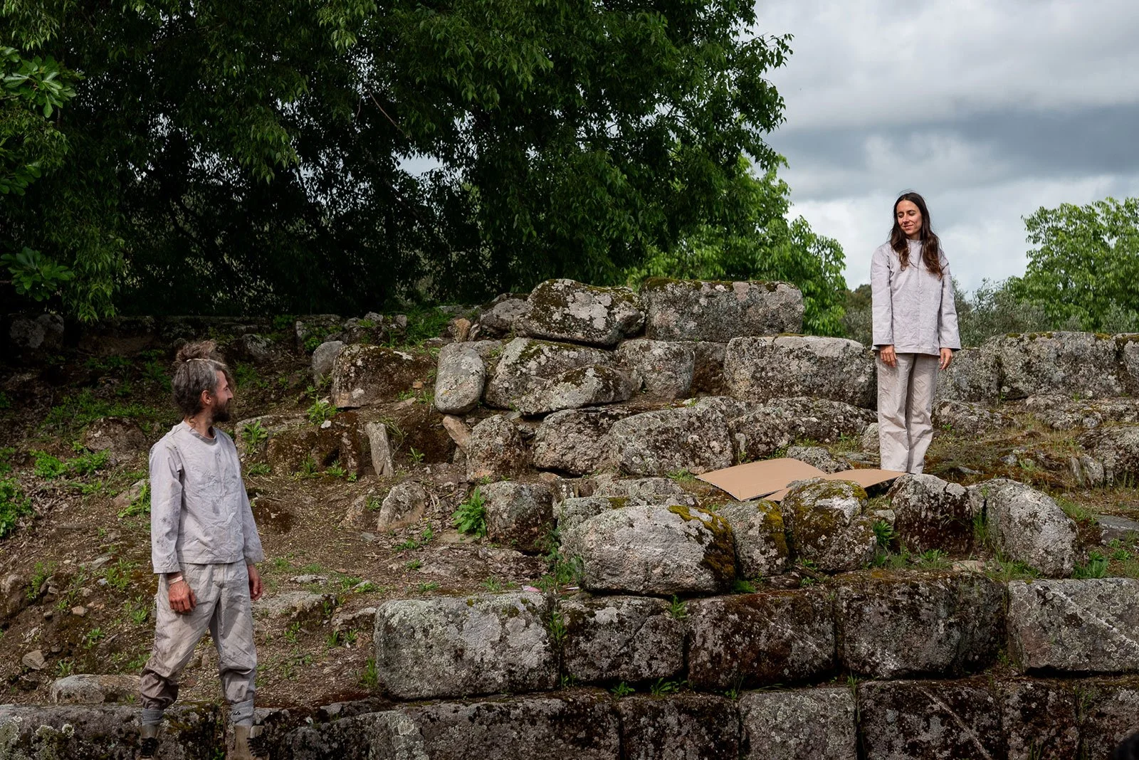 O encontro pela terra começa num círculo, na margem da aldeia. Um aquecimento para chegar, abrandar e entrar. Com exercícios para se ativarem as articulações, a respiração e a voz, focados num trabalho sobre o centro do corpo, para se fortalecer o veículo da presença e o estar na paisagem.